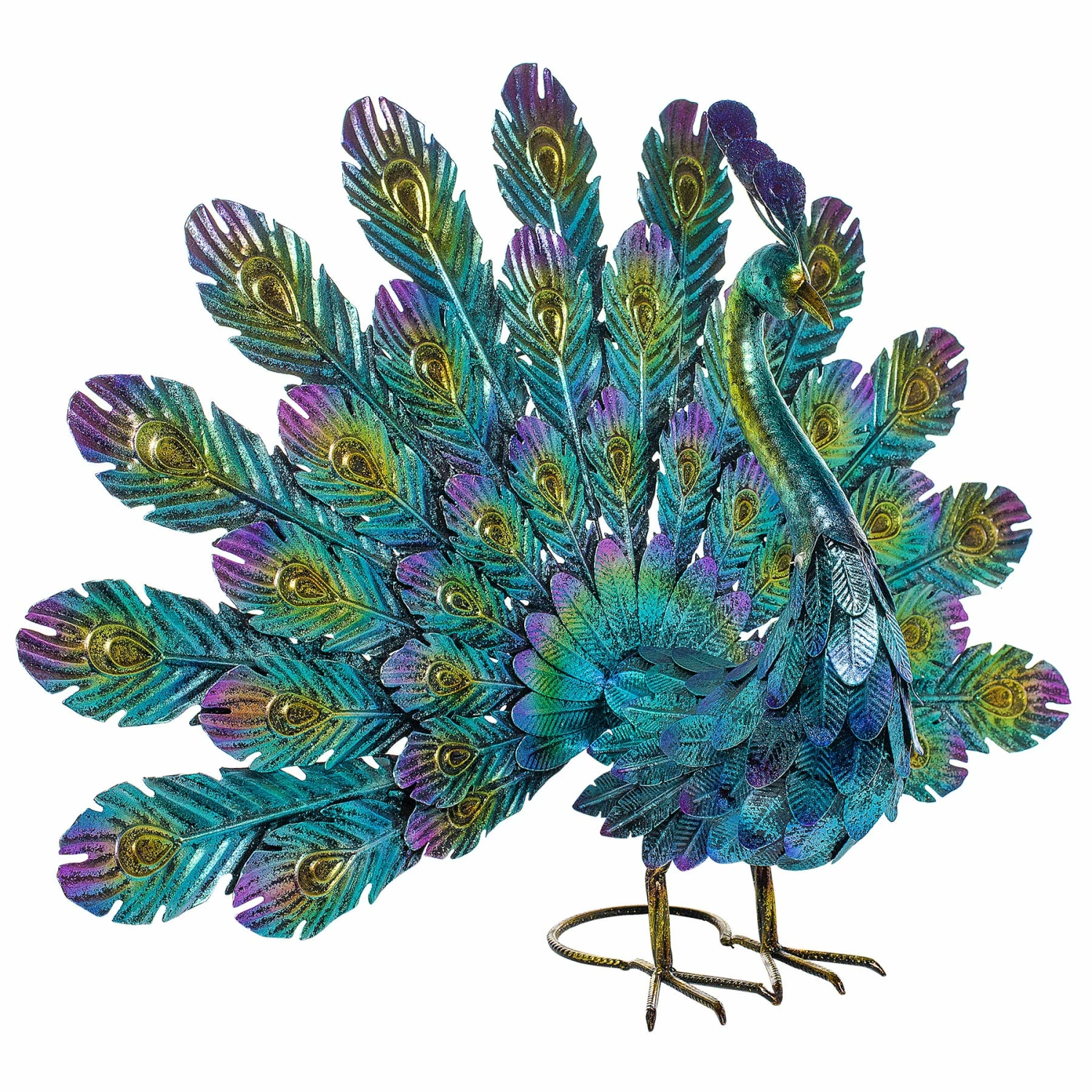 This metal peacock is an elegant edition to any space. Self standing and crafted with beautiful textures and colors.