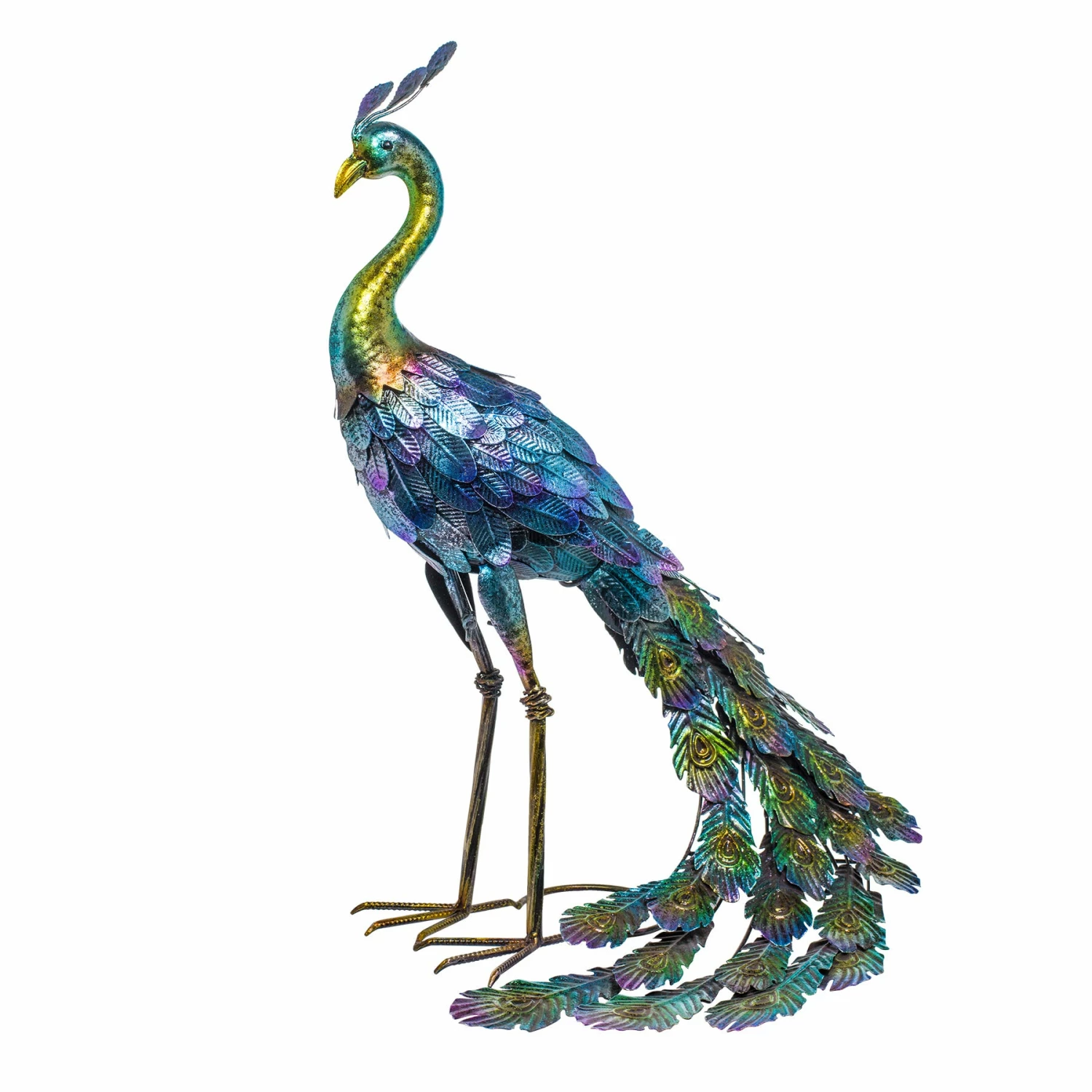 This metal peacock is an elegant edition to any space. Self standing and crafted with beautiful textures and colors.