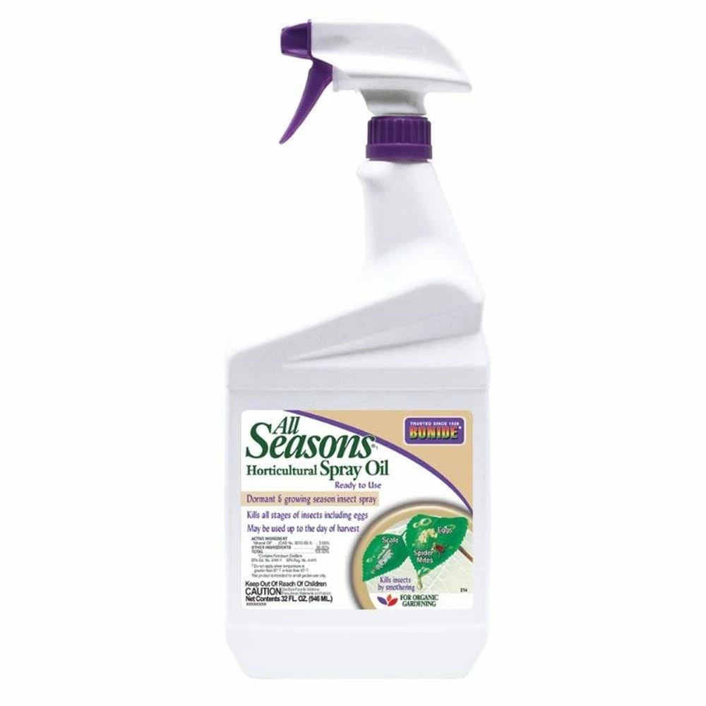 For organic gardening. A superior type of paraffinic oil that may be used as a growing season spray, dormant spray (no leaves) or delayed dormant (green tip) spray to control overwintering eggs of red spiders, scale insects, aphids, bud moths, leaf roller, red bug, codling moth, blister mites, galls, whitefly, mealy bugs and other insects and diseases. Highly recommended for use on fruit trees, shade trees, shrubs, ornamentals, roses, and vegetables. Safe and pleasant to use.