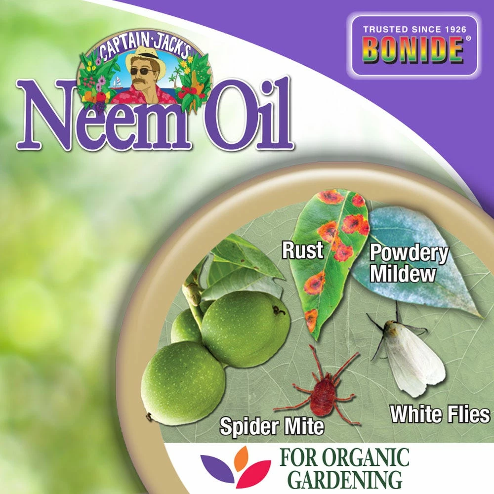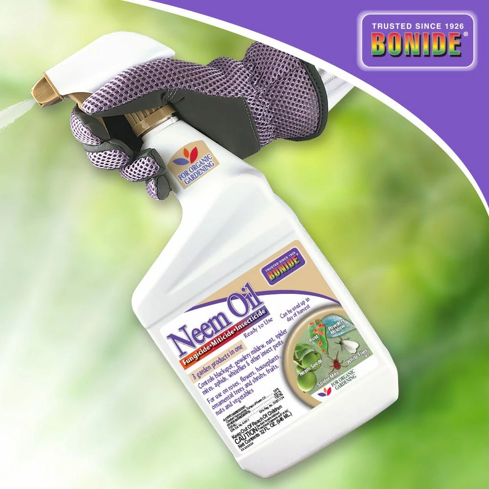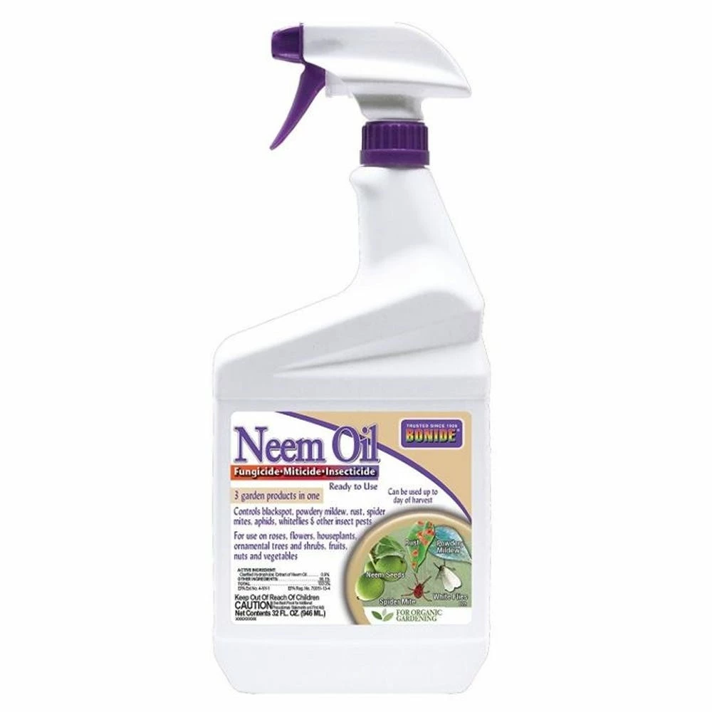 An all-purpose insecticide, miticide, and fungicide for organic gardening that is derived from the Neem seed. Safe to use on roses, flowers, vegetables, herbs, spices, houseplants, trees, turf and shrubs. Kills all stages of insects including eggs, larvae, and adults.