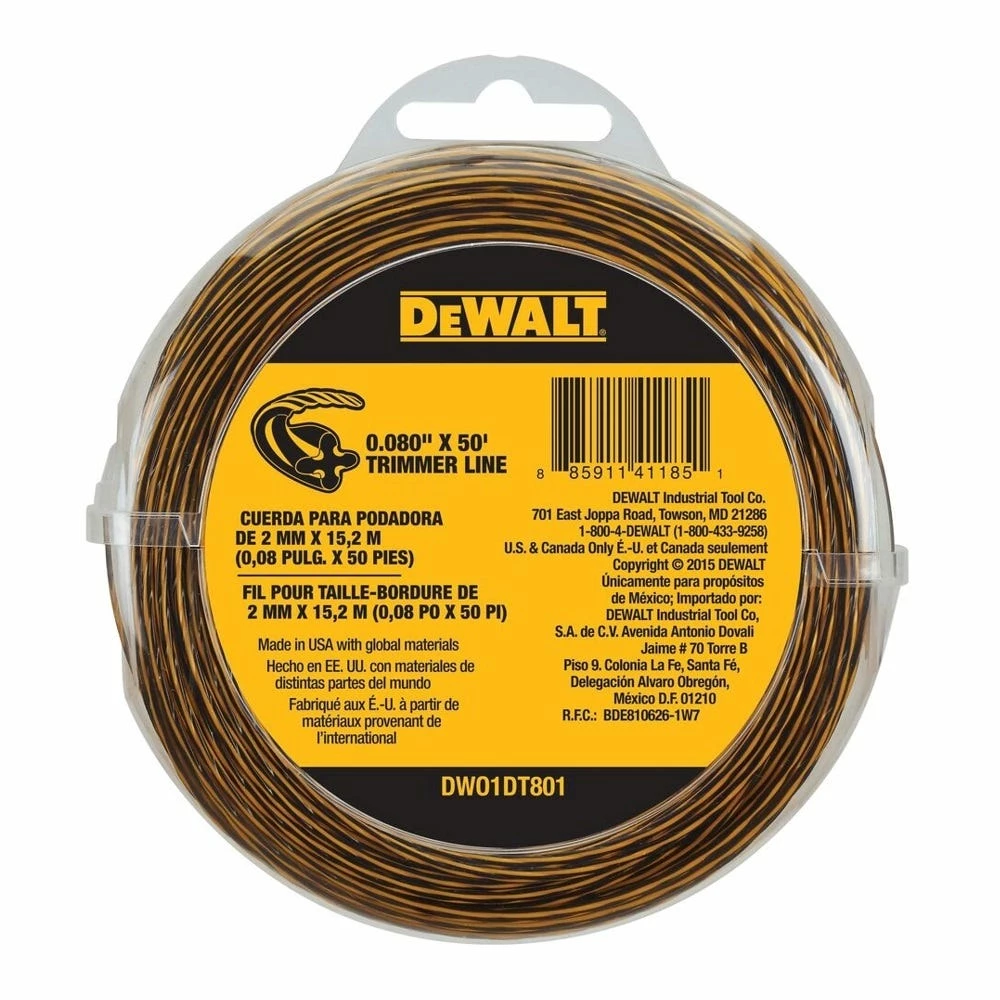 Keep your DEWALT string trimmer cutting with DWO1DT801 replacement trimmer line. Made of flexible and impact resistant materials. This package includes 50 ft. of trimming line.
