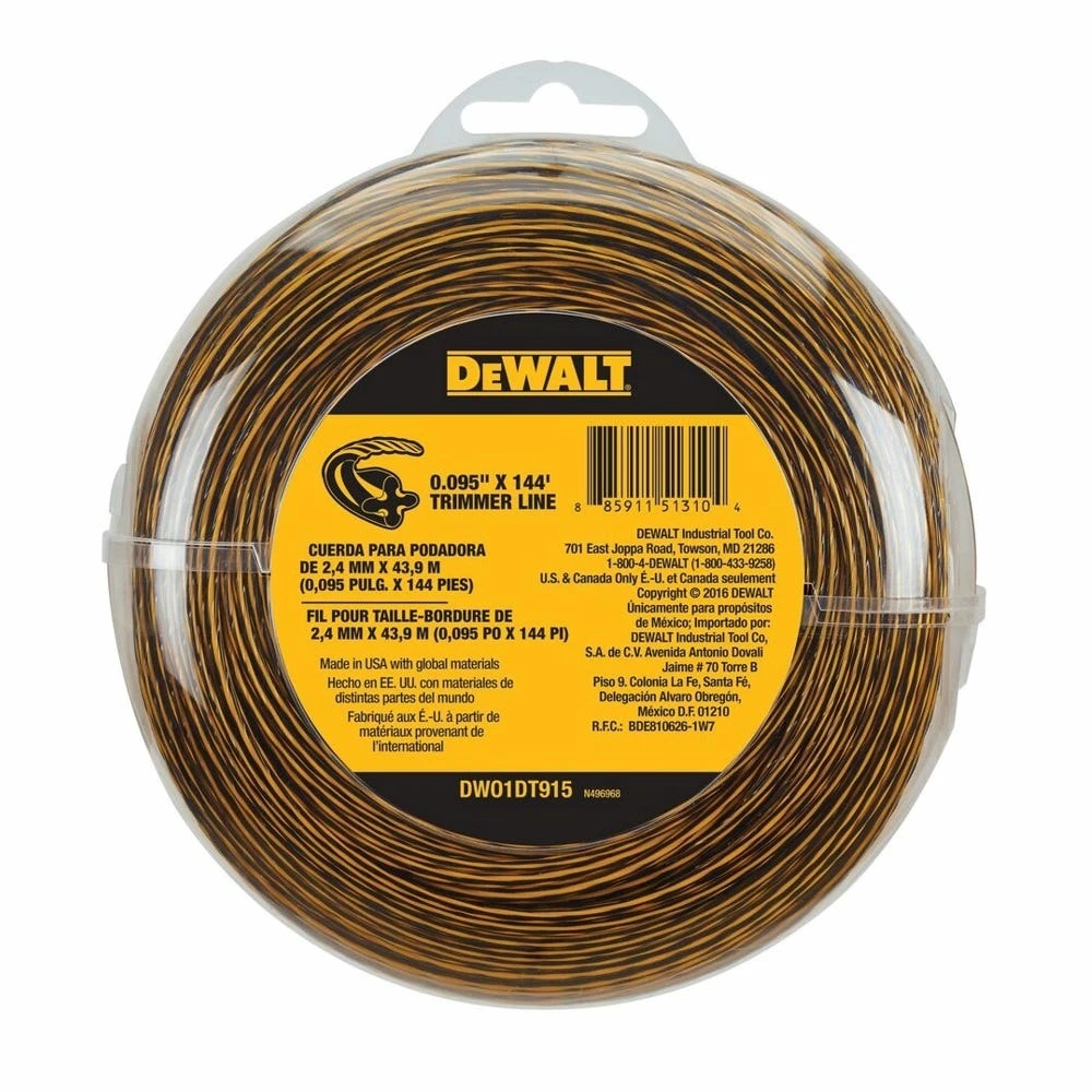 The DEWALT DWO1DT915 trimmer line keeps your trimmer head full and ready to go. This bulk package of 144 ft. allows for economical change of line. Compatible with: DCST990B, DCST990M1, DCST990H1, DCST990X1, DCST970X1, DWO1DT980.