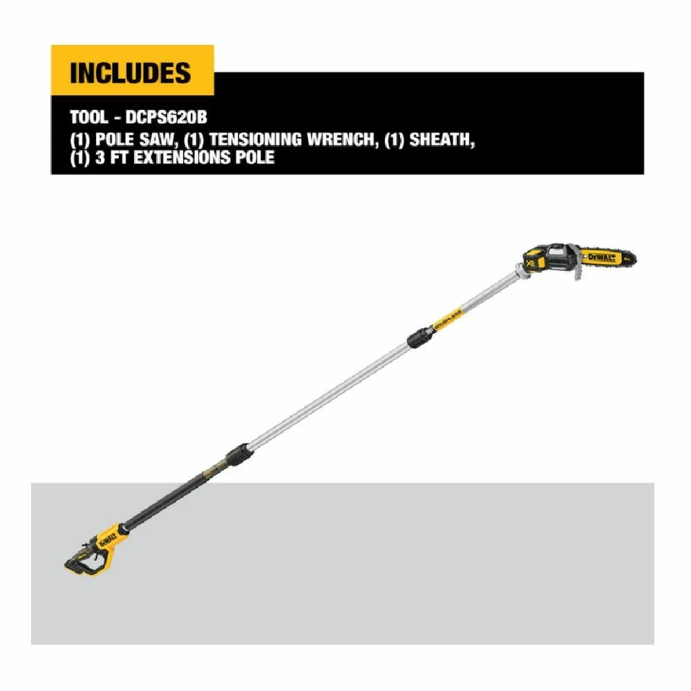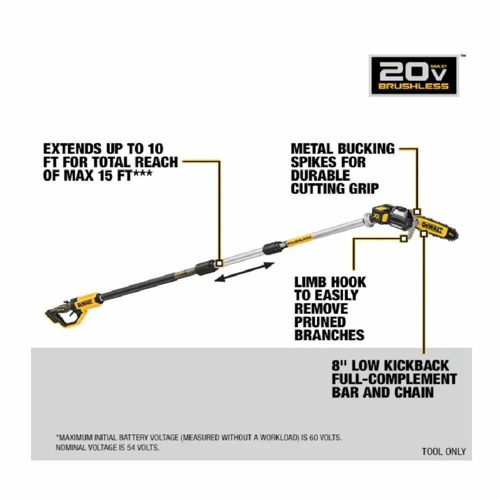 The DEWALT DCPS620B is ideal for many trimming applications with a 15 ft. Maximum Reach. This pole saw can perform 96 cuts per charge on a 4×4 pressure treated pine with a 4.0 Ah 20-Volt battery. A brushless motor delivers power for up to a 16″ cut.