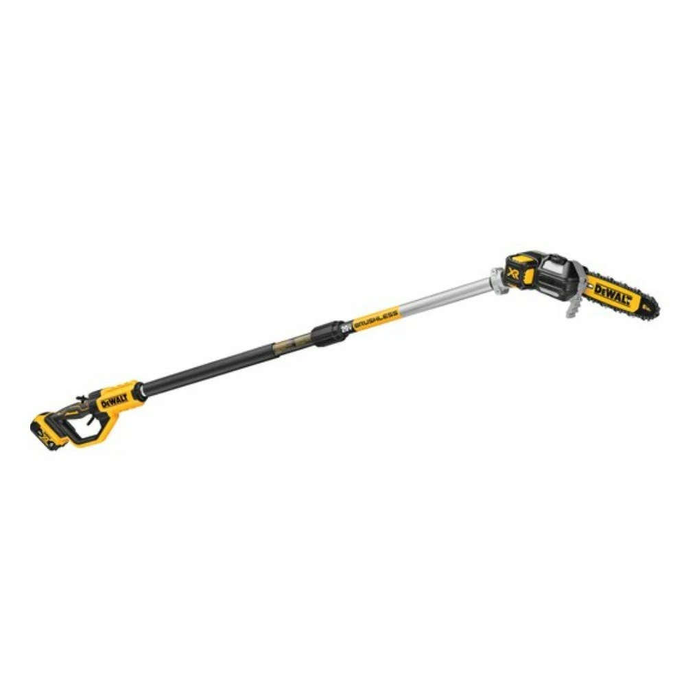 The DEWALT 20-Volt MAX XR Brushless Cordless Pole Saw comes equipped with an 8″ Bar and Chain to handle all of your pruning needs. It features a high efficiency brushless motor that delivers up to 96 cuts per charge. The well balanced design and durable pole shaft extends up to 10 ft. for a total reach of 15 ft. It has an auto oiling feature for added convenience and time saving. It also features metal bucking strips for a durable cutting grip and a tree hook allows you to easily remove pruned branches.