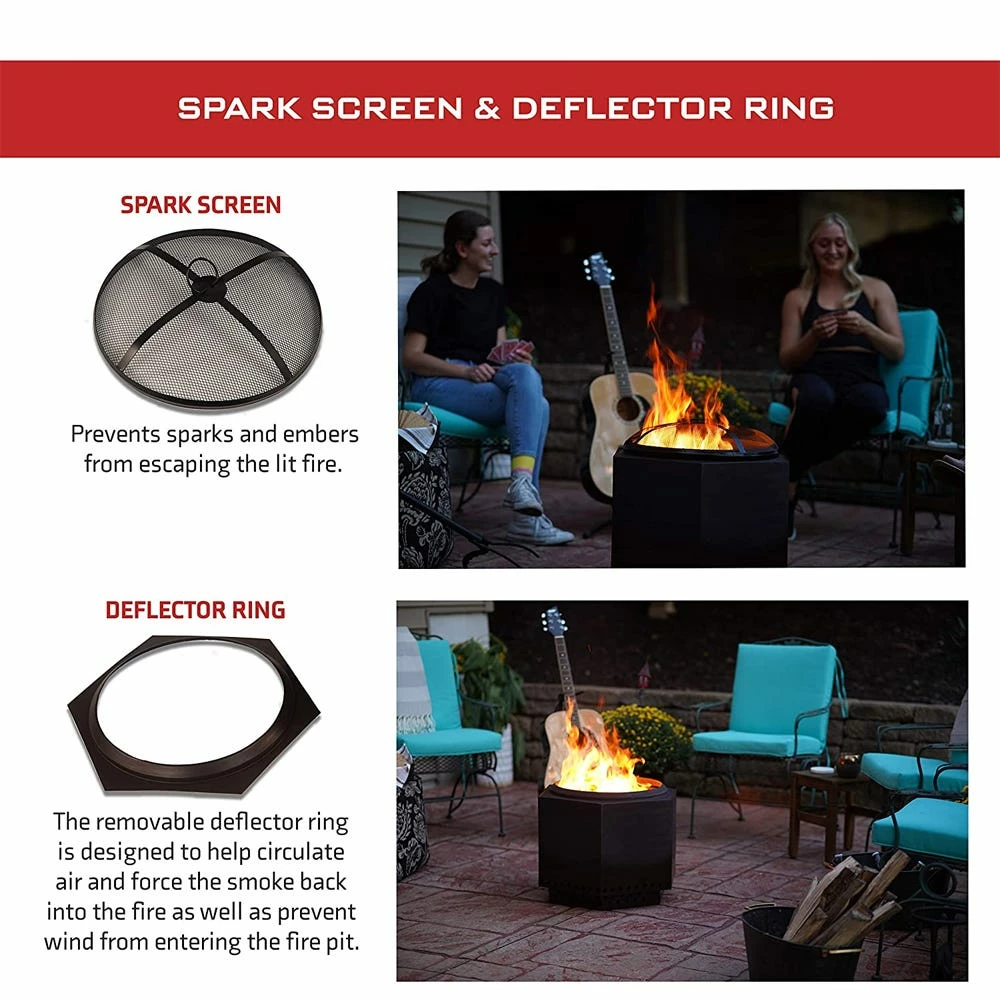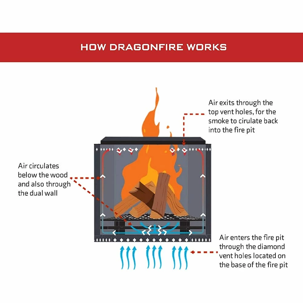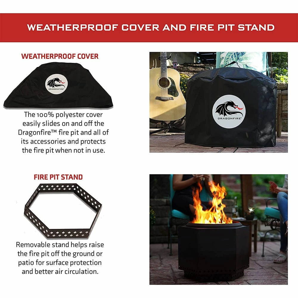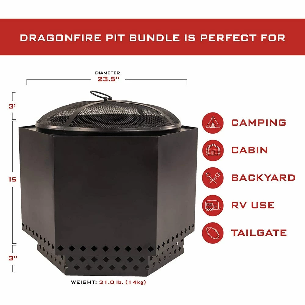 Enjoy your fire without the nuisance of smoke. The Dragonfire Fire Pit Bundle is perfect for relaxing in your backyard or your favorite outdoor spot. The fire pit bundle includes a portable dual-wall fire pit, a deflector ring, a fire pit stand, a spark screen, & an all-weather 100% polyester cover. The dual wall allows you to enjoy your fire without the nuisance of smoke, as the smoke circulates within the fire pit. The spark screen keeps the hot embers away from you, your guests and the patio/deck surface. The Dragonfire Fire Pit is the perfect addition to your camping, tailgating, RV, or picnic experience. We recommend using dry wood logs for the best fire experience.