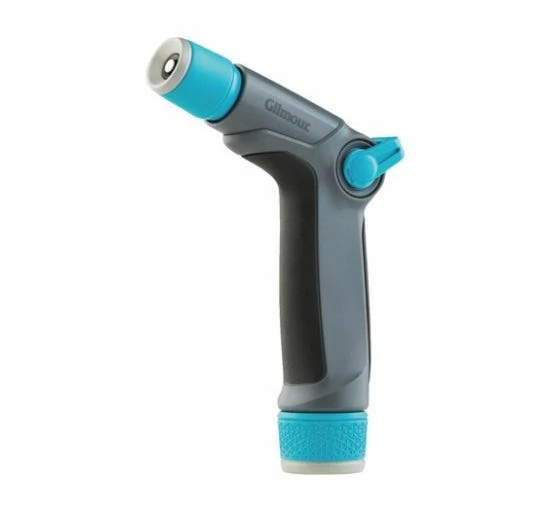 Gilmour Thumb Control Pistol Nozzle Medium-duty thumb control cleaning nozzle with complete flow range from on to off. Features a swivel connection which increases mobility, allows nozzle to pivot without twisting the hose and reduces kink potential. One-turn adjustment of the nozzle head allows user to move from jet to rinse in one turn. Ergonomic design optimizes control location and makes nozzle easy to grip and operate. Handle features structured contours ensuring the nozzle fits snugly in the hand. Durable metal secures and reinforces impact points. ManufactureΒ offers a Lifetime warranty.