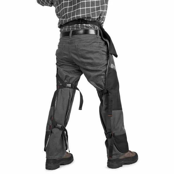 5 layer frontal apron chainsaw chaps contain PVC coated 600 denier polyester with Tek warp protective layers. It’s designed to reduce risk or severity of an injury and give the saw operator extra reaction time when contact is made by a moving chain. Protective chainsaw chaps should never be considered safer than proper chainsaw handling safety procedures. Always check with your manual for chainsaw safety guidance.