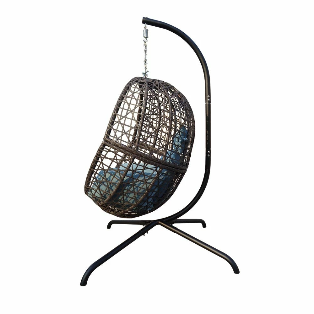 This Hanging Egg Swing Chair comes with a soft deep fluffy cushion, perfect for you to snuggle up on a warm and sunny day with a book and a coffee. The seat and frame of the hanging chair is constructed of polyethylene rattan resin wicker wrapped around an aluminum frame for weather-resistant protection and a powder-coated steel standing pole for strength and durability. This unique swinging chair is the perfect addition to any space, like a backyard patio, deck, sunroom, garden, near a pool or outdoor bar. This chair and stand are simple to put together. Everything you need is in the box, including the chair, headrest pillow, seat cushion, and stand. Chair provides a relaxing seat for one person.