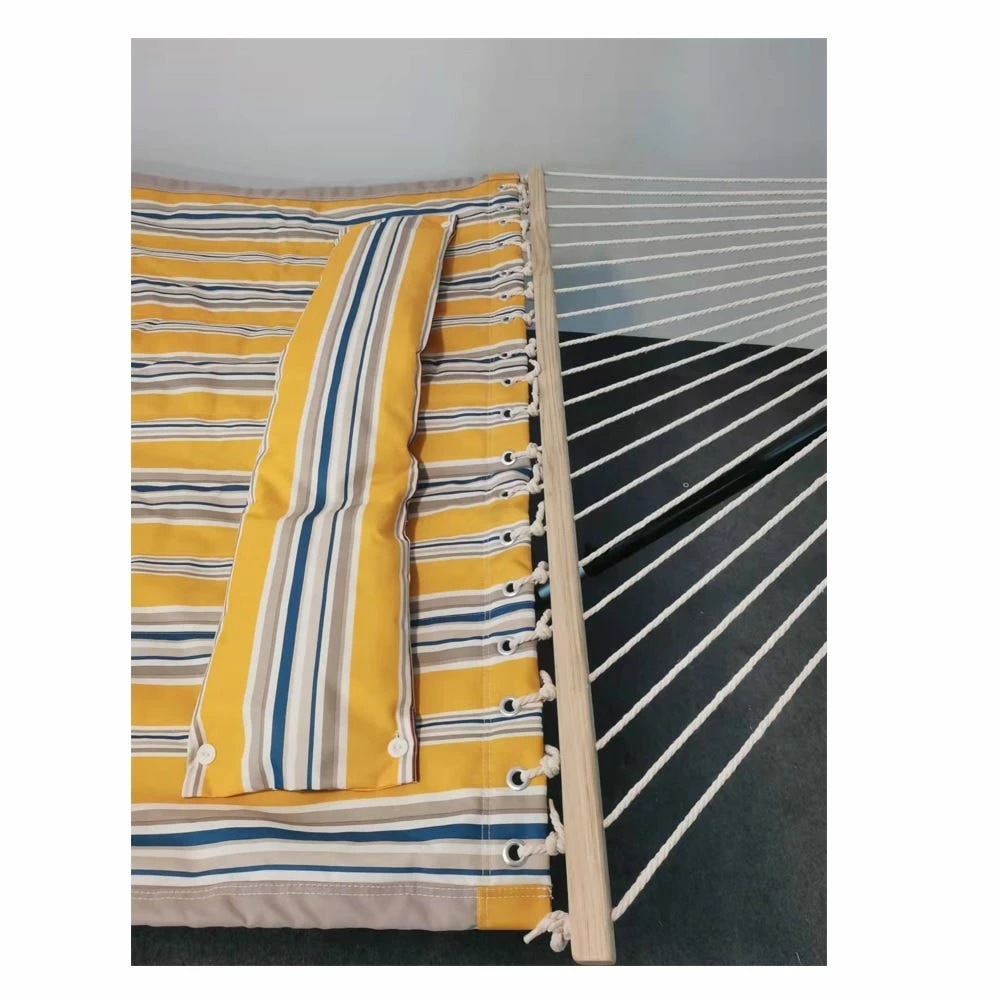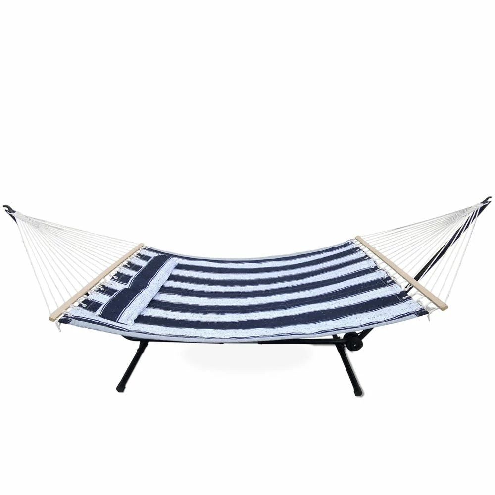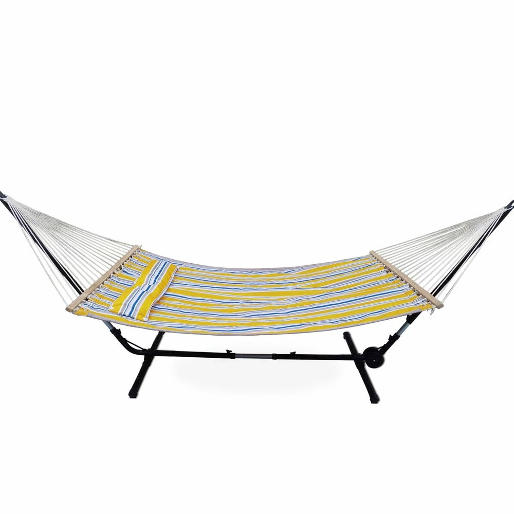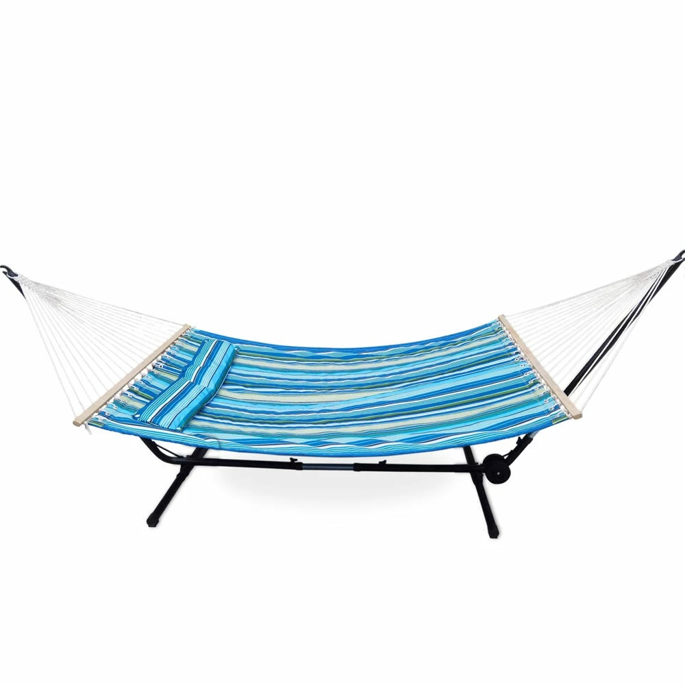 The Maple Ridge quilted hammock is made from 100% polyester fabric, cotton rope and hardwood spreader bars. Includes a matching pillow and can accommodate two people. This is the perfect piece to complete your outdoor collection for a peaceful oasis right in your own backyard.