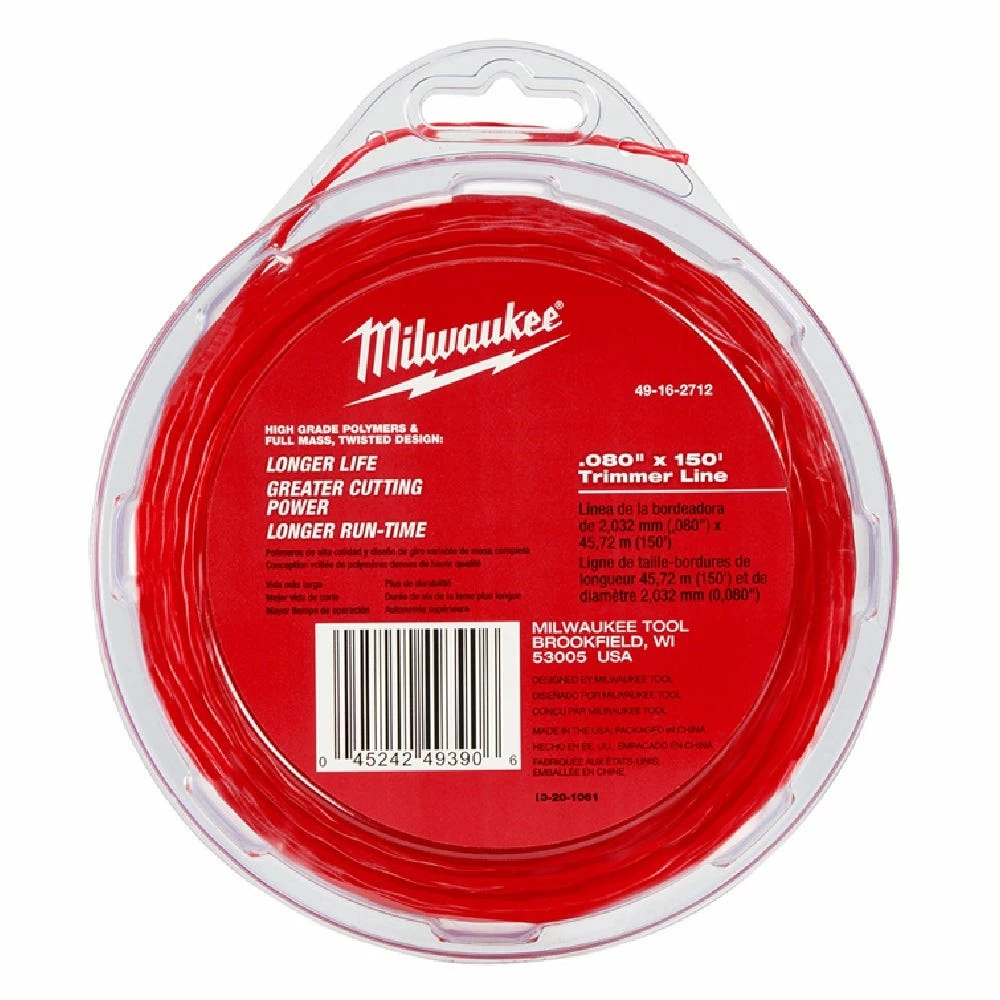 The Milwaukee 0.080 in. string trimmer line utilizes high grade polymers and a full mass, twisted design to provide longer life and greater cutting power. Optimized for the M18 FUEL String Trimmer, the line produces less noise and longer run time. The donut includes 150 ft. of .080 in. line.