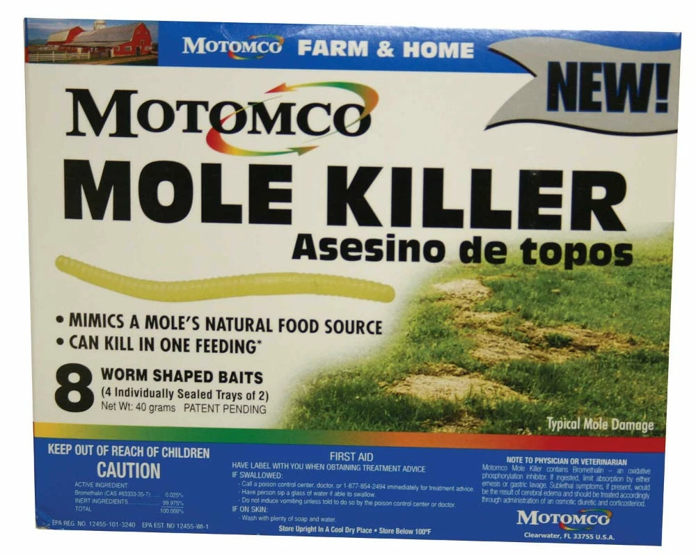 Motomcoβs complete mole control program includes mole killer, a revolutionary mole bait, and Motomcoβs new mole trap.