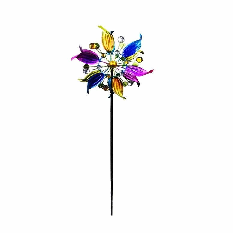 This beautiful colorful metal with jewels creates a mesmerizing spinning effect in your yard or garden. Let the wind catch the blades and the fun begins.