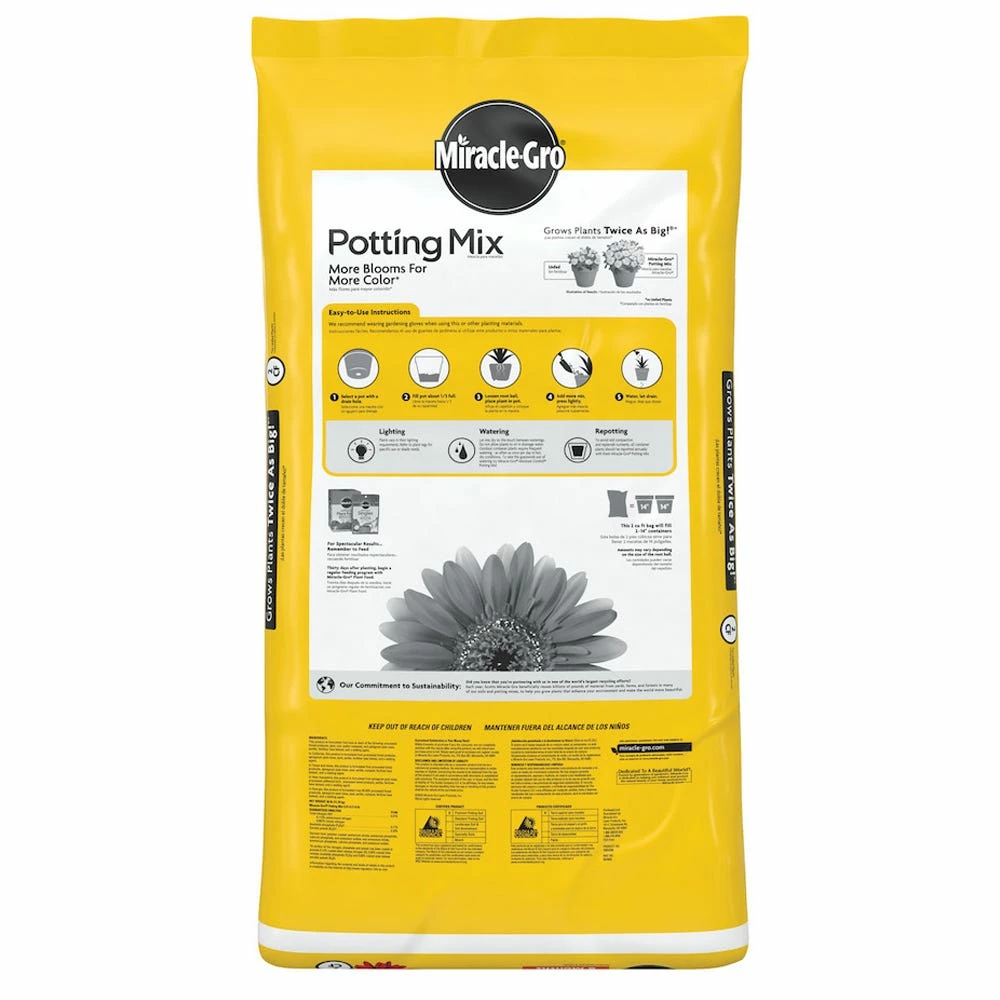 Your plants want to show off. Give indoor and outdoor container plants the right ingredients to grow bigger and more beautiful with Miracle-Gro Potting Mix. Our specially formulated mix feeds for up to 6 months for more blooms and more color (vs. unfed plants). Use with indoor and outdoor container plants. Grows Plants Twice as Big (vs. unfed plants)!