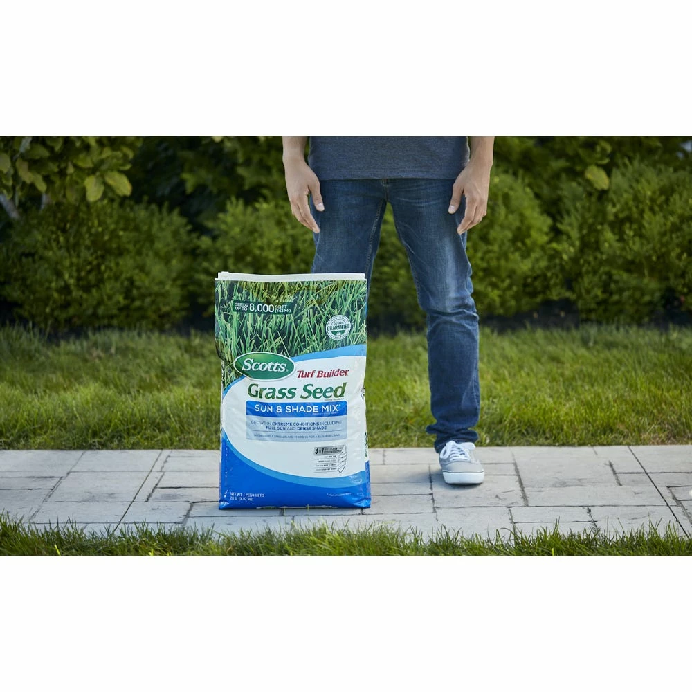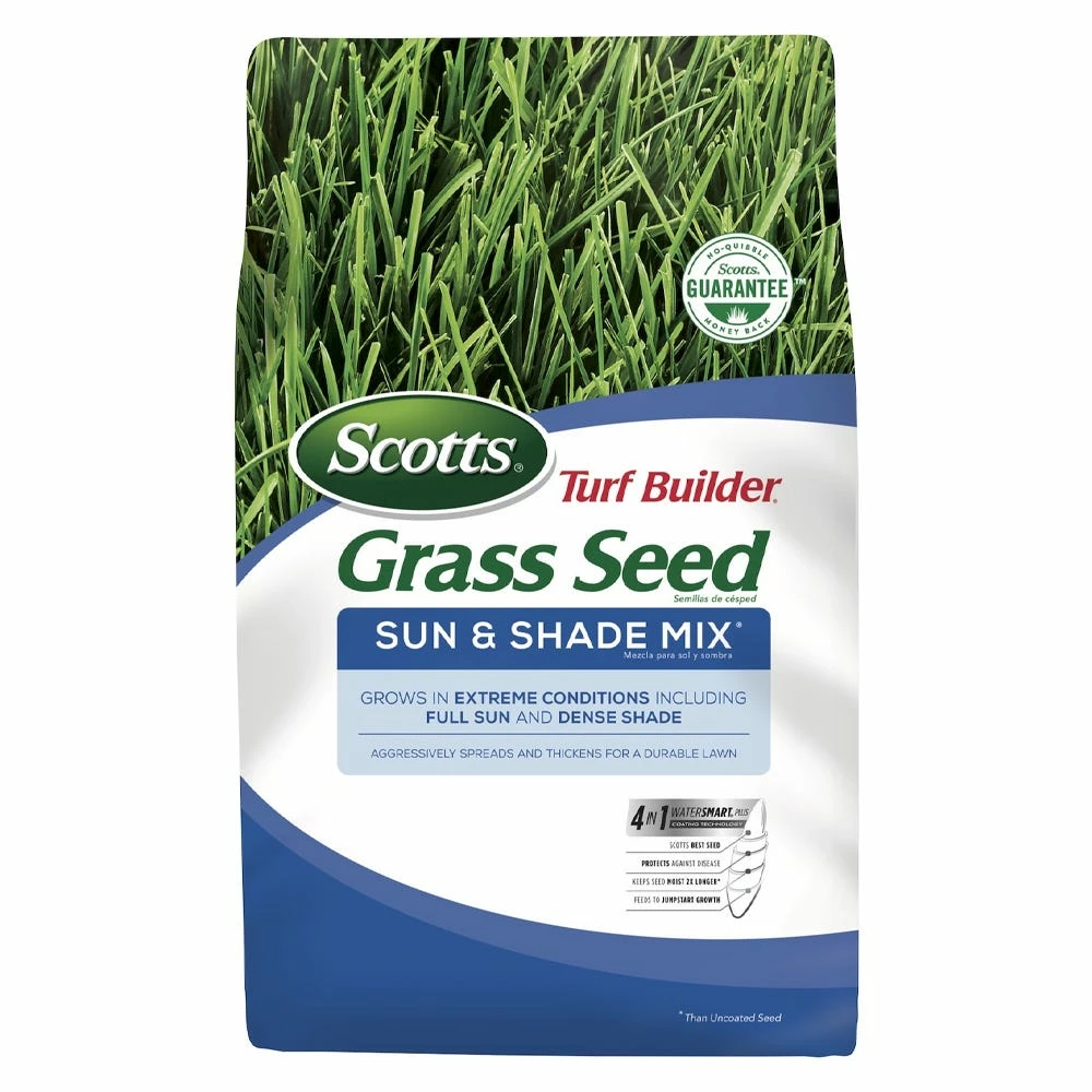 Scotts Turf Builder Grass Seed Sun & Shade Mix is Scotts most versatile mix that stays green even in extreme conditions of dense shade or scorching sun. Scotts wraps each seed in a unique 4 in 1 WaterSmart PLUS Coating that absorbs 2x more water than uncoated seed, feeds with essential nutrients, and helps protect seedlings from disease. Grow Quicker, Thicker, Greener Grass. Guaranteed.
