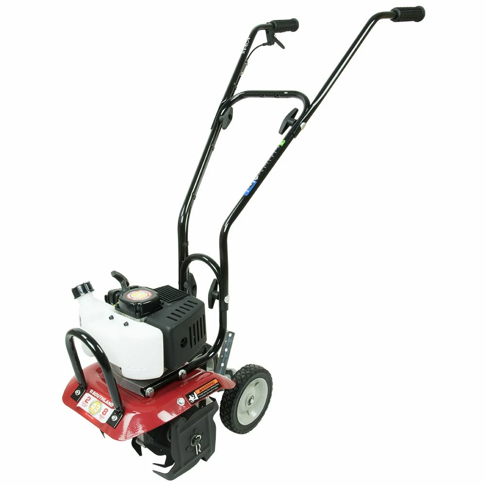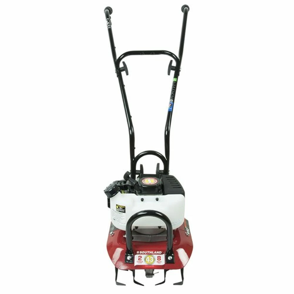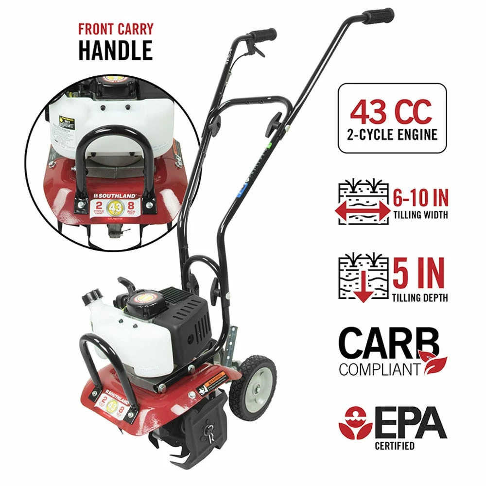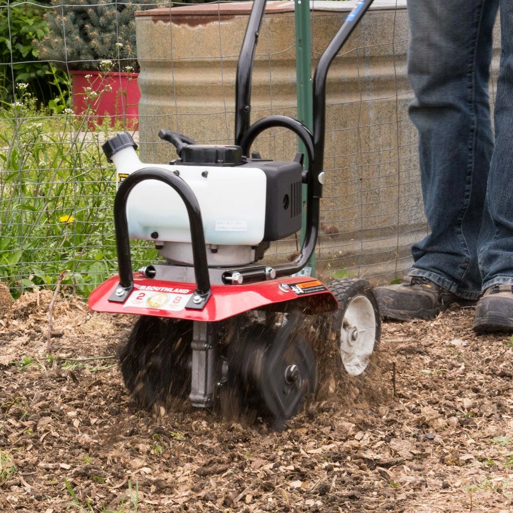 Perfectly prep your soil with the Southland Cultivator. The Southland 10 in. 43cc Gas 2-Cycle Cultivator is designed to help you accomplish a variety of cultivation and tilling tasks around your home and property. It is built for dependable, trouble-free performance and is backed by an extensive service network to keep the cultivator running strong for years to come. The adjustable tilling widths of 6 in. – 10 in. and up to 5 in. tilling depth make easy work of weeding and aerating soil. Equipped with 7 in. rear wheels, this cultivator is easy to maneuver around lawns and gardens. The comfortable design allows you to work until the job is done. A 3-piece foldable handle allows for convenient storage and a front carry handle provides maximum portability.