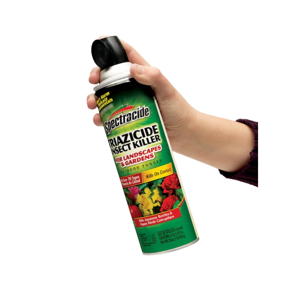 The power is in your hands to keep your landscape in line β unleash it with Spectracide lawn and garden products. Our easy-to-use, fast-acting insect, lawn disease and weed control solutions help you tame lawn and landscape invaders with incredible pest-punishing power. Take command with Spectracide brand. You hold the power. Spectracide Triazicide Insect Killer For Landscapes and Gardens Outdoor Fogger kills over 70 types of insects as listed on contact, including Japanese beetles and gypsy moth caterpillars. The fogging spray protects landscapes and gardens, and is ideal for use on most vegetables, herbs, fruits and nuts, and garden ornamentals as listed. It wonβt harm delicate ornamentals when used and stored as directed. This formula kills listed garden insects, including ants, sod webworms, aphids, beetles, whiteflies, fleas, mites, stink bugs, deer ticks, crane flies and others (see product label for complete list)(. Spray with the can 18 to 24 inches away from the foliage to be treated; apply to provide thorough coverage of upper and lower leaf surfaces. Repeat treatment weekly or as needed to control infestations. One 16 ounce can treats 20 square feet of surface area.