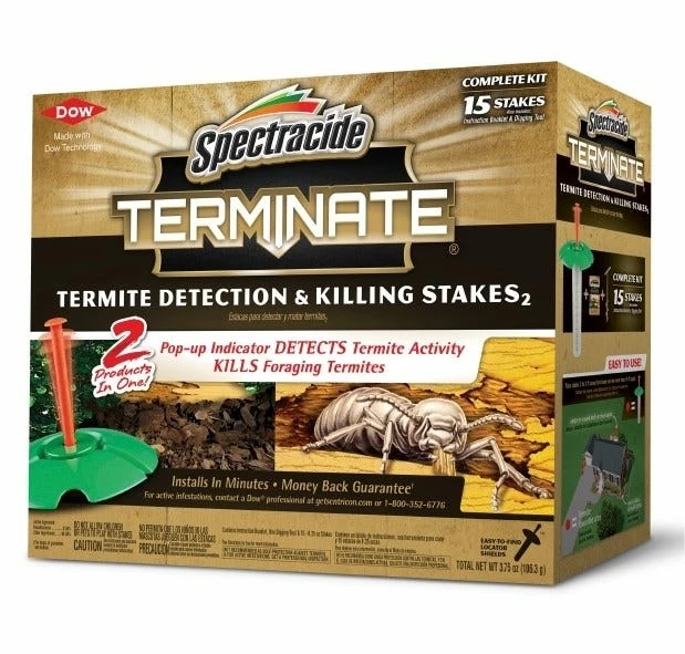 Spectracide Terminate Termite Detection & Killing Stakes is two products in one – the pop-up indicators detect termite activity, and the stakes kill foraging termites. Install in minutes. This complete kit includes 15 stakes with easy-to-find locator shields, an instruction booklet and a digging tool. Place the stakes 2 to 3 feet away from your home and no more than 10 feet apart. Use stakes in termite-favorable areas, including under around decks or crawl spaces – place more stakes in moist areas. Made with Dow Technology. Money-back guarantee (see product packaging for details). Read and follow all directions before using this product. Termites rarely come to the surfaces of what they’re eating, so most of the time you will never know they have invaded your home until it is too late. Using Spectracide Terminate Termite Detection & Killing Stakes2 is an important step toward reducing your risk of termite damage. It is very important that you monitor your stakes as directed and replace all stakes after 12 months of use. Not recommended as sole protection against termites, and for active infestations, get a professional inspection. Dow is a registered trademark of The Dow Chemical Company.