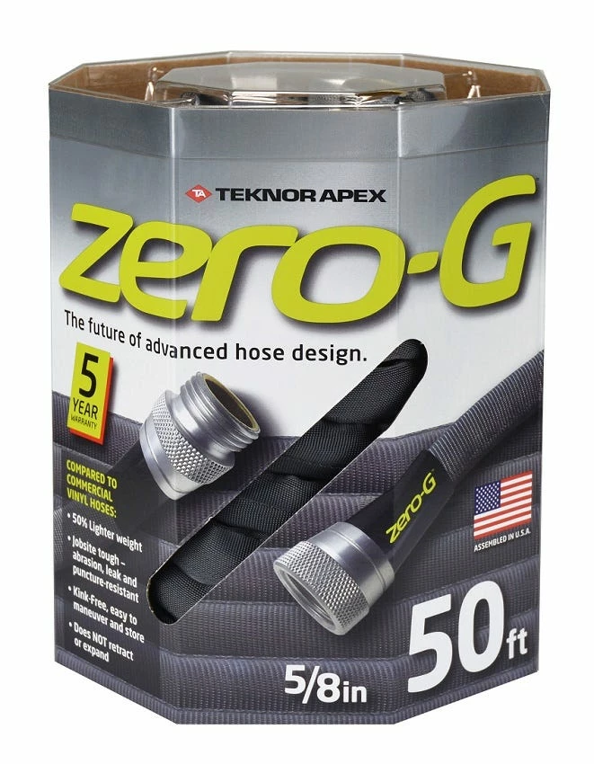 Take the work out of yard work. Teknor Apex has the solution. The Zero-G® hose is up to 50% lighter in weight than standard garden hoses, which provides for easy coiling, maneuverability and compact storage. The hose is equipped with an abrasion, leak and puncture-resistant G-Force™ outer cover for longer performance. Is garden hose features improved ergonomic grips for easier attachment and commercial grade crush-resistant coupling with brass threads to help prevent corrosion. Works with all of your hose attachments like nozzles, sprayers and sprinklers so all of your watering can be done with one lightweight hose. Try Zero-G today. The new standard in advanced hose design and performance.
