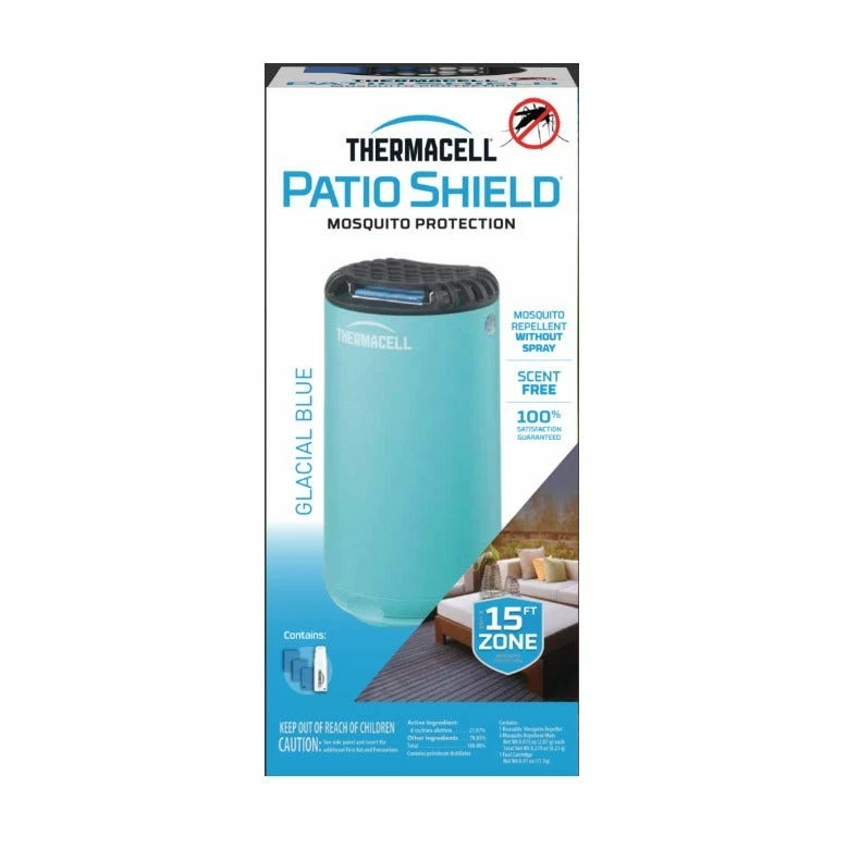 The Thermacell Patio Shield Mosquito Repeller, Blue effectively repels mosquitoes by creating a 15-foot zone of protection. This compact and stylish device will look great on any patio or deck while it works to repel pesky mosquitoes. Ideal for use while entertaining. Thermacell Patio Shield is powered by a Thermacell fuel cartridge which creates heat to activate the repellent Allethrin, a synthetic version of a naturally occurring repellent found in chrysanthemum flowers. Heat disperses the repellent creating a 15-foot zone of protection. Thermacell protects millions of people from mosquitoes with no messy sprays or lotions, no scent, no noise, no DEET, and no open flames. For best results, use on days with light or no wind (bugs are at their worst on these days), and allow 10-15 minutes to form a complete zone of protection. Thermacell products are safe, effective, and come with a 100% Satisfaction Guarantee. With Thermacell, Turn it on⦠Mosquitoes GONE!