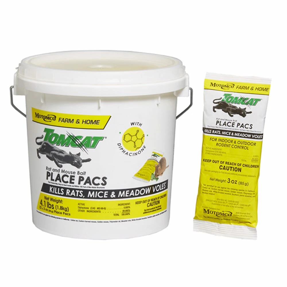 Tomcat Rat and Mouse Bait Place Pacs are a proven, versatile way to control rats and mice.Β Β They provide economical control using the active ingredient Diphacinone, a multiple feed anticoagulant that has delivered proven results for more than 25 years.Β Ready-to-use Place Pacs are pre-measured with 3 oz. of pelleted bait, and keep bait fresh by protecting the pellets from contamination by odors, dirt, and moisture.Β Β Great for putting bait in tight spaces and hard to reach areas.