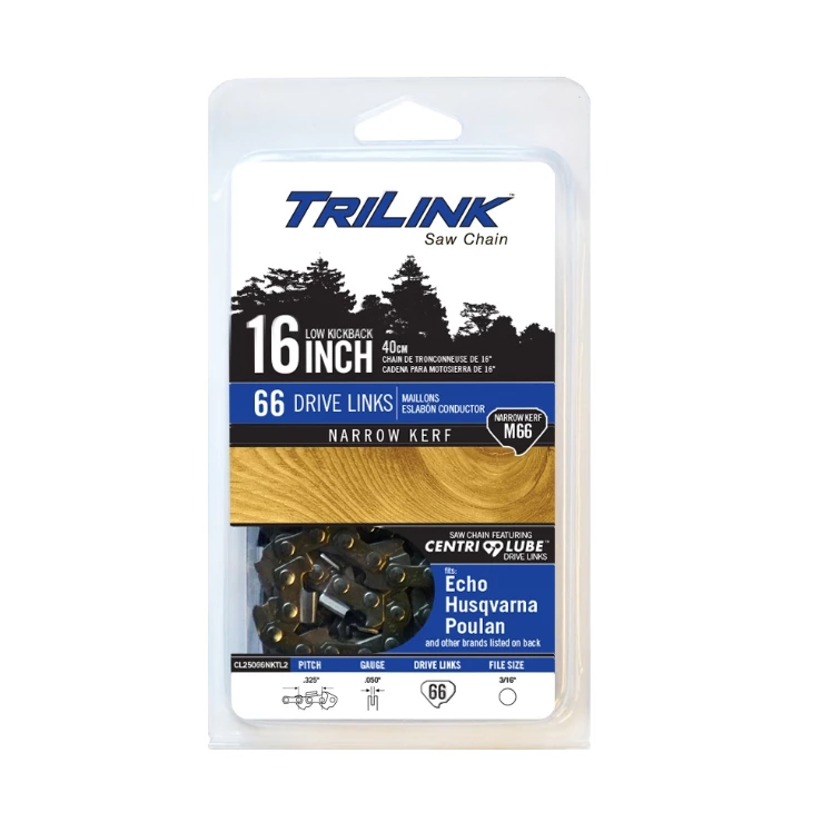 TriLink saw chain has chromed cutters for fast, smooth cutting and low kickback design for safety and durability; Please see fit up guide for complete list of compatible chainsaws; Underwriterβs laboratories (UL) certified to American National Standards Institute (ANSI) standards for low kickback safety chain; Centri-lube self-lubricating drive links that enhance chain life and reduce stretch