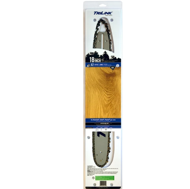 This TriLink 18 in. bar and chain combination features TriLink low kickback (S62) Centri-Lube saw chain. The light weight guide bar is reversible for a long cutting life. The productβs hardened guide bar rails and precision bearings provide long life and smooth chain action along the guide bar.