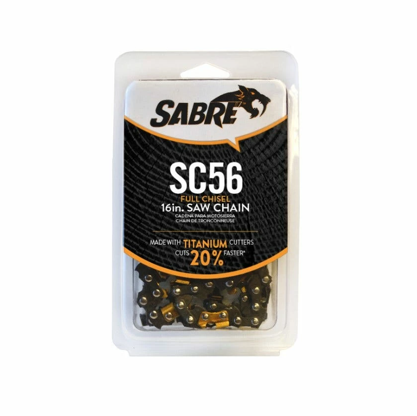 Sabre’s SC56 chain is a full chisel 3/8βLP pitch chain with hardened, chrome and titanium coated cutters designed for high-speed, excellent chip clearance in clean conditions. Sabre full chisel chain cuts 20% faster than semi-chisel chain. The full chisel chain is preferred by professional users. Sabre chain features the Centri-Lubeβ’ oil distribution system. Centri-Lubeβ’ pulls oil from the bar and distributes to the chainβs rivets reducing stretch, limiting field adjustments, and extending the life of the chain.