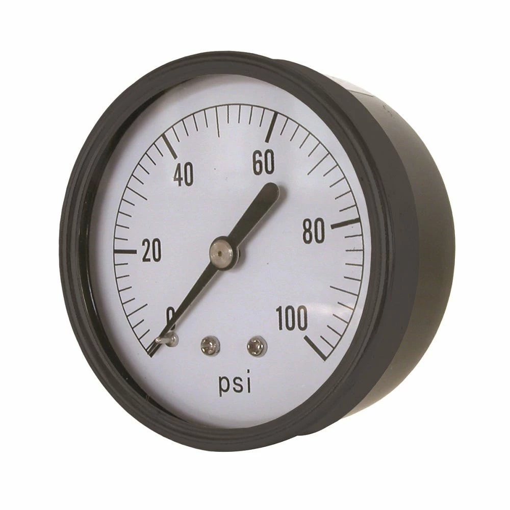 The Valley Industries Universal 100 PSI 2 Inch Dry Back Mount Gauge was designed to be used for applications such as chemicals, fuels, oil and water or any medium not corrosive to brass or bronze. Featuring a brass movement with phosphor bronze bourdon tube. Built with an Acrylic window and ABS standard Steel for increased durability. ΒΌ Inch MNPT 316 brass male connection. Grade B accuracy. Black enameled aluminum pointer and white background. Fill made of dry material only. Perfect for Master Manufacturing and other branded sprayers.