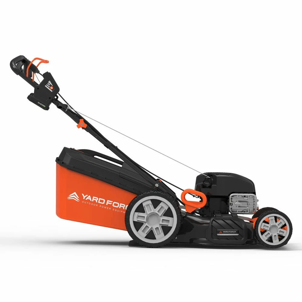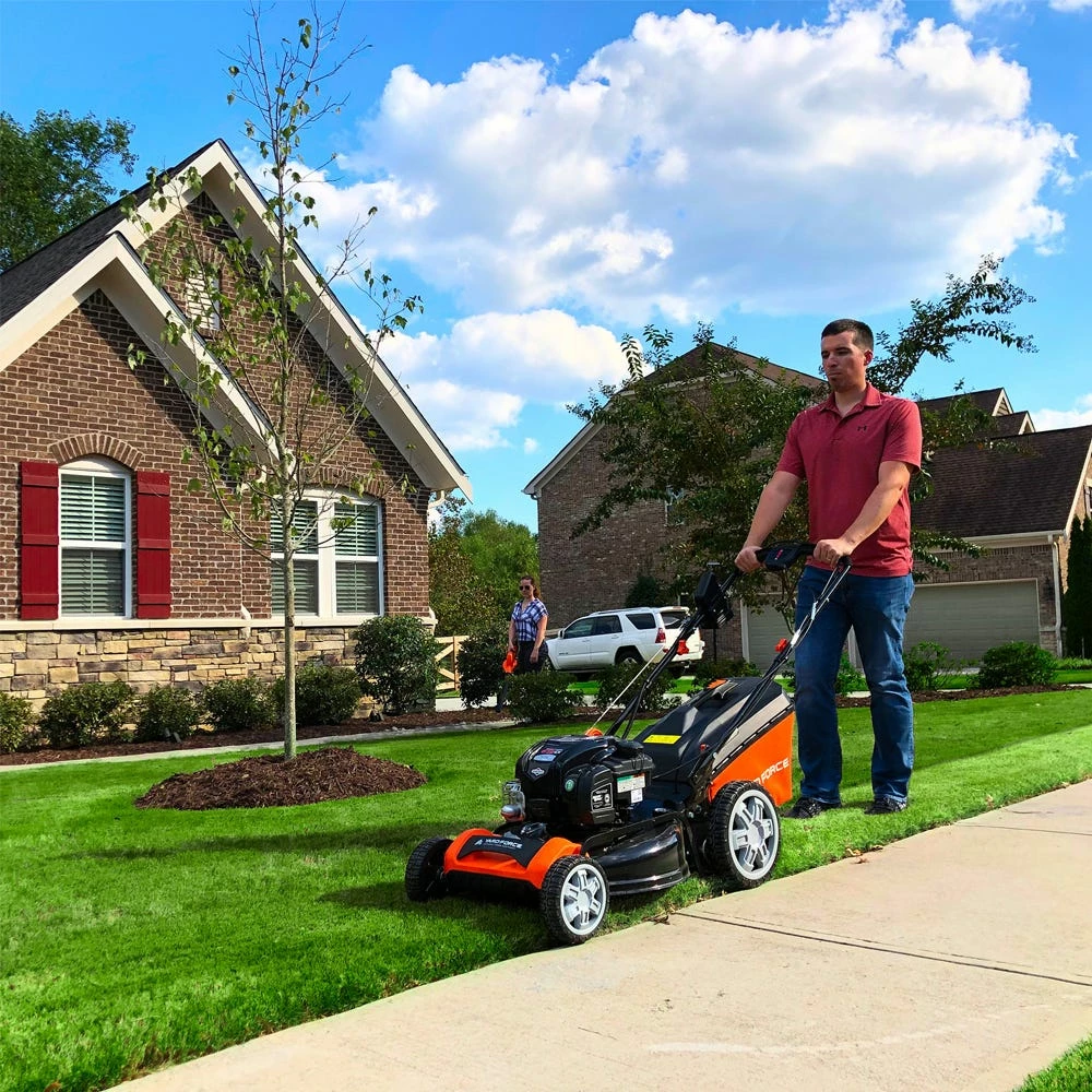 The YARD FORCE YF22ESSPV is powered for performance. Step up to variable speed self-propelled power drive with a simple control lever on the handle to reduce effort and achieve a perfect cut every time. The YF22ESSPV has a Briggs and Stratton 675 EXi engine with heavy-duty features for durability and high performance. Easy starting with Briggs and Stratton’s ReadyStart starting system – no prime or choke, just press the start button for power. Easy maintenance – this engine never needs an oil change with Briggs and Stratton’s Just Check and Add technology. Simply add oil if it’s low. The electric start is powered by the YARD FORCE 20-Volt Xtra Lithium-Ion compact battery. It slides into the holster in the water-tight compartment for easy access. You will get up to 75 starts from a single charge. Adjust the speed with the touch of a lever at your fingertips. Self-propelled drive is essential for yards with hills and slopes of all degrees to maintain a consistent cut and is safer by providing more control during operation. Bonus KIT: this kit include a 20-Volt blower-sweep that uses the same battery as the mower. Great for clearing grass clippings from sidewalks, driveways and decks. Keep the garage floor clean, kids play areas, gutters and more. This 2-speed blower has powerful 140 MPH at the 90 CFM performance.